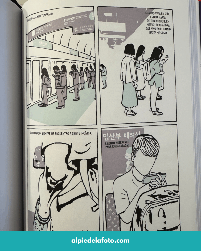 Keum Suk Gendry-Kim logra dibujar precisamente esa posición incómoda. Y lo hace desde un lugar aún más incómodo: viviendo cerca de la frontera, con el ruido de las bombas que llega hasta su cocina, su habitación, hasta el lugar donde pasea con sus perros. La amenaza no es abstracta ni lejana, la amenaza forma parte de su paisaje diario.