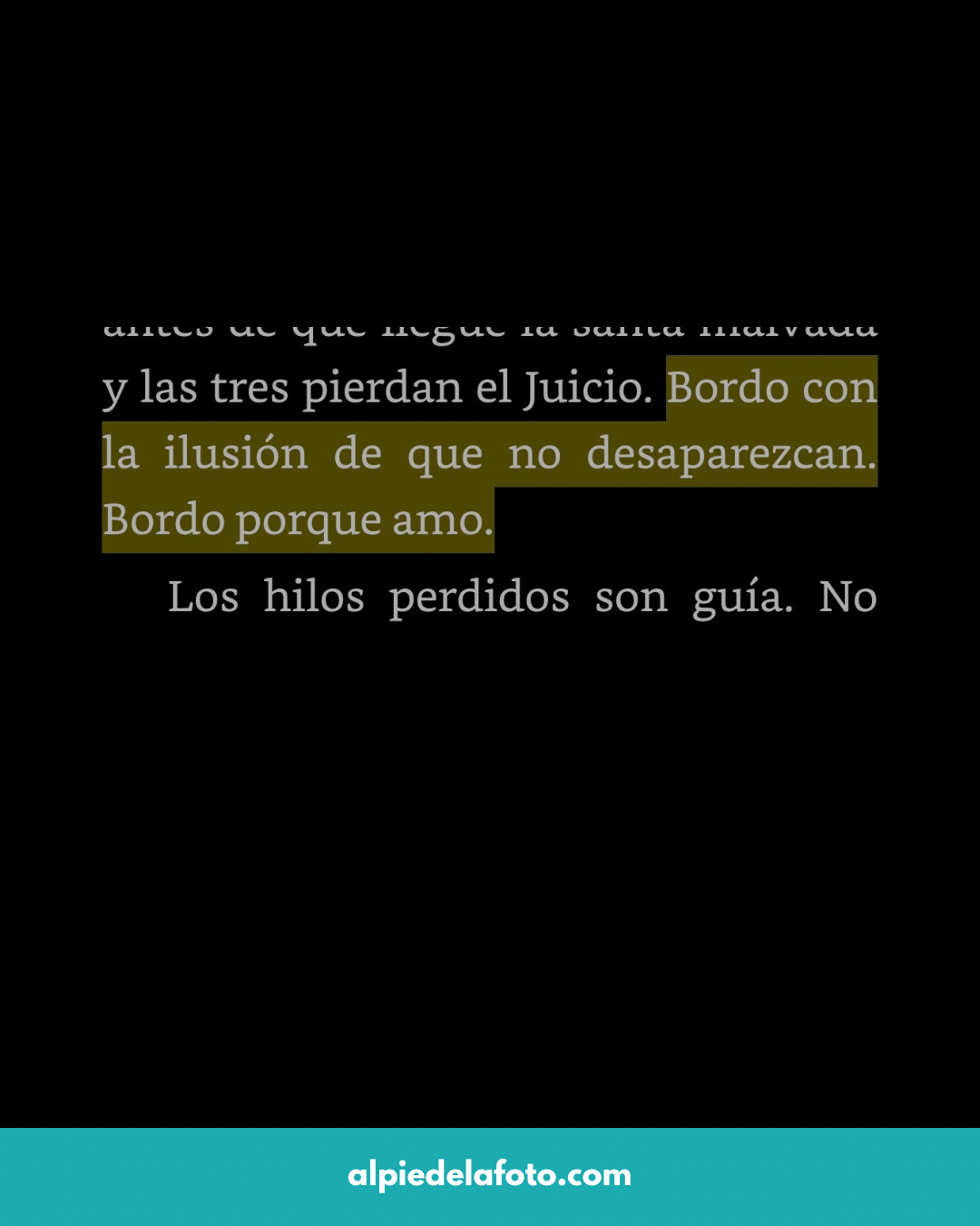 Yo también bordo. Y leo. Y quizá por eso el libro me ha atravesado con una delicadeza especial. Me ha parecido tan hermoso y tan tierno que, por momentos, me he perdido en mis propios recuerdos: en las manos que aprendieron antes que yo, en los objetos que sobreviven a quienes los usaron, en esa transmisión silenciosa que no siempre pasa por las palabras. Por momentos, también, me he detenido en esas sentencias mínimas y luminosas sobre el sentido de los hilos, los nudos y las pérdidas. Frases que se quedan.
